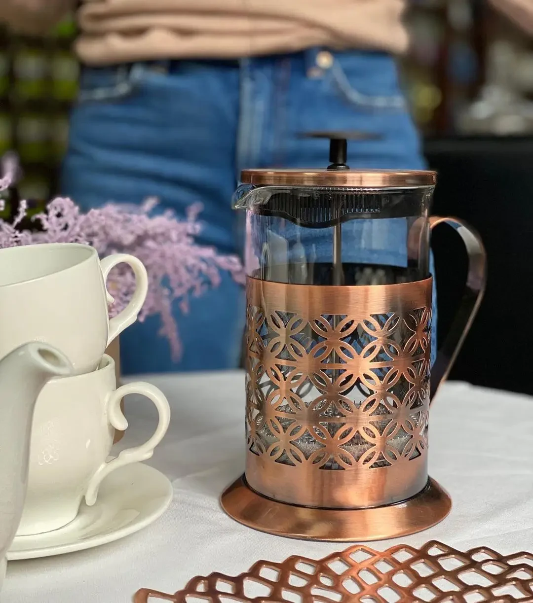 Френч-прес "Антик-латунь" - це скляний чайник з пресом, в якому можна заварювати багато різних напоїв: каву, листяні чаї, ягідні чаї та інше відварювання. Об'єм - 350 мл.