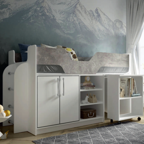 Сучасне та компактне дитяче ліжко-чердак зі зручним ліжком, шафою та столом для занять.