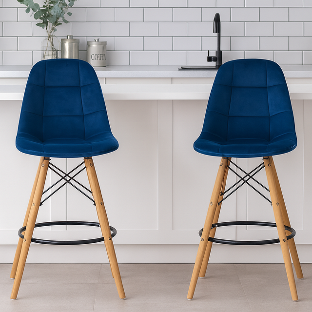 Модель із м’яким сидінням з велюру, дерев’яними ніжками та металевою круглою підніжкою стане ідеальним вибором для кухні, барної стійки чи кафе. Стілець оснащений спинкою, не регулюється по висоті та не обертається, що робить конструкцію міцною і надійною.