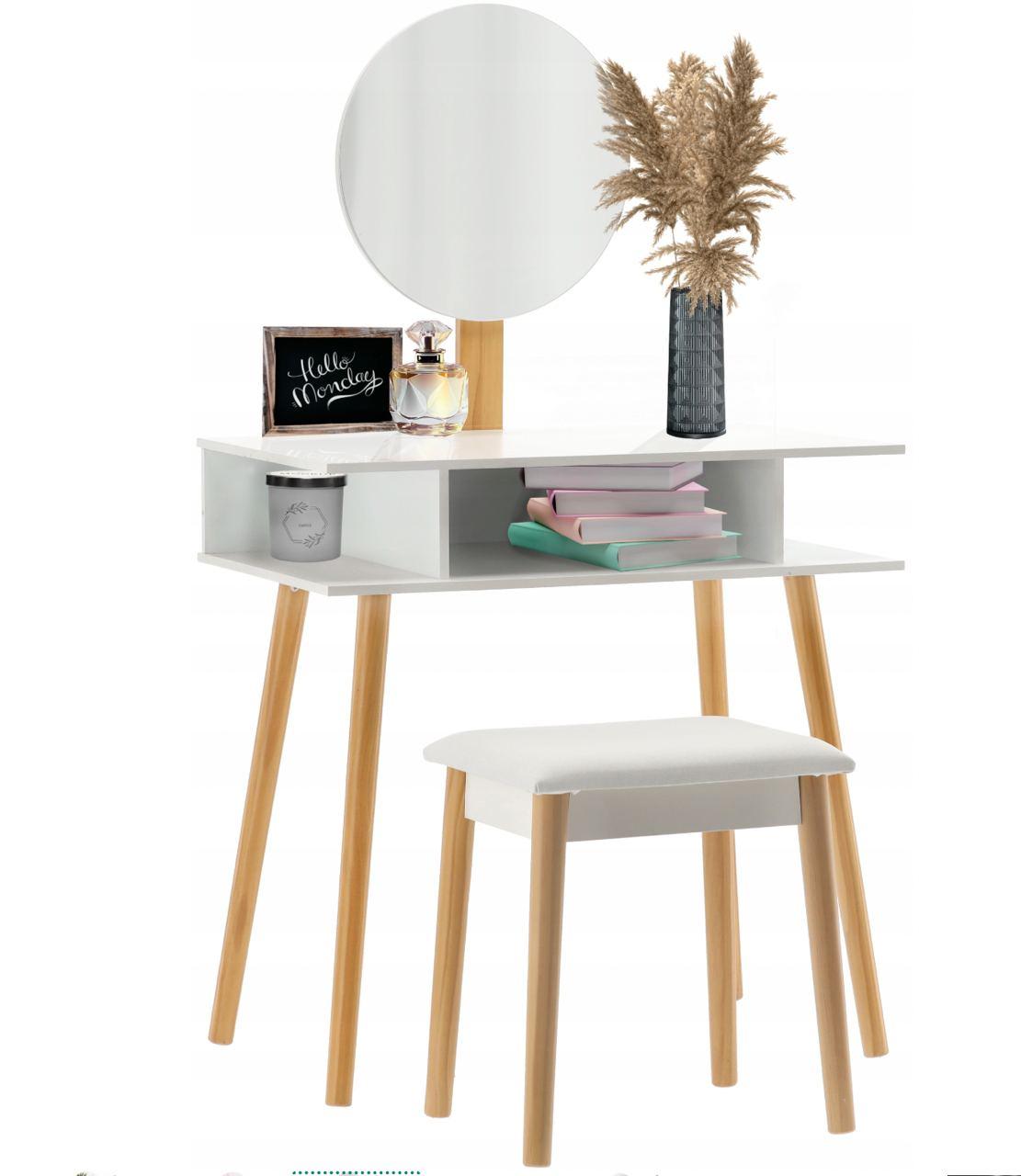 Центральним елементом туалетного столика є кругле дзеркало, яке надає йому шарму та функціональності. Воно дозволяє контролювати свій зовнішній вигляд з усіх боків, полегшуючи щоденний догляд за собою та підготовку до дня.